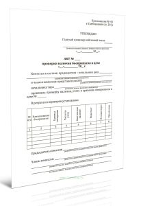 Форма Акта проверки наличия боеприпасов в цехе соответствует Приложению 43 к Приказу Министра обороны РФ от 8 июля 2020 г. N 299.