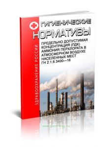 В соответствии с Федеральным законом от 30.03.1999 N 52-ФЗ "О санитарно-эпидемиологическом благополучии населения" и постановлением Правительства Российской Федерации от 24.07.2000 N 554 "Об утверждении Положения о государственной санитарно-эпидемиологической службе Российской Федерации и Положения о государственном санитарно-эпидемиологическом нормировании" утвердены гигиенический норматив ГН 2.1.6.3400-16 "Предельно допустимая концентрация (ПДК) аммония перхлората в атмосферном воздухе населенных мест".