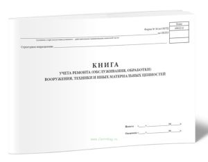 Книга применяется для учета произведенных ремонтов (технических обслуживаний, регламентных работ, обработки) вооружения, техники и иных материальных ценностей. Она служит также для учета замененных агрегатов, израсходованных частей, ЗИП и других материальных запасов.
