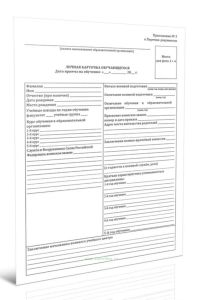Форма личной карточки обучающегося соответствует Приложению 3 к Приказу Министра обороны РФ N 66, Минобрнауки России N 212 от 13.02.2020 "Об установлении Порядка замещения должностей работников военного учебного центра при федеральной государственной образовательной организации высшего образования, Перечня отчетных документов, а также документов, которые разрабатываются и ведутся в военном учебном центре при федеральной государственной образовательной организации высшего образования, документов по планированию, организации проведения образовательной деятельности, учету граждан, проходящих военную подготовку, учету и обслуживанию военной техники, Порядка контроля организации деятельности военных учебных центров при федеральных государственных образовательных организациях высшего образования и проведения военной подготовки"