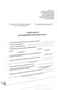 Форма Наряда-допуска на проведение ремонтных работ соответствует Приложению 5 к Федеральным нормам и правилам в области промышленной безопасности «Правила безопасного ведения газоопасных, огневых и ремонтных работ»