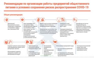 На плакате содержатся рекомендации по организации работы предприятий общественного питания в условиях сохранения рисков распространения COVID-19: