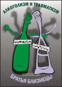 Плакат содержит надпись "Алкоголизм и травматизм - братья-близнецы", призывающую не употреблять алкоголь, чтобы уберечь себя от травм.