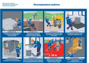 Плакат содержит актуальные и подробные сведения о технике безопасности при выполнении изоляционных работ. Он включает в себя информацию о мерах предосторожности при работе с различными материалами.