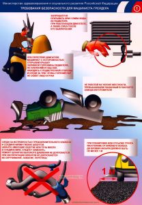 Плакат наглядно и доступно информирует машинистов грейдера о мерах безопасности, необходимых для предотвращения несчастных случаев и травм на рабочем месте. Он включает в себя ключевые требования безопасности, связанные с: