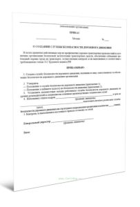 В целях принятия действенных мер по профилактике дорожно-транспортных происшествий и улучшению организации безопасной эксплуатации транспортных средств, обеспечения соблюдения требований охраны труда на транспорте, осуществления контроля за их выполнением в соответствии с требованиями статьи 212 Трудового кодекса РФ создается служба безопасности дорожного движения, которая утверждается приказом.