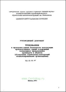 Настоящие Требования к проведению оценки безопасности эксплуатации производственных зданий и сооружений поднадзорных промышленных производств и объектов (обследование строительных конструкций специализированными организациями) (далее Требования) разработаны в соответствии с Федеральным Законом "О промышленной безопасности опасных производственных объектов" 1997г, со СНиП III-18-75, 3.03.01-87, II-23-81, Руководством по эксплуатации строительных конструкций производственных зданий и сооружений (ЦНИИпромздания 1995г.) и другими отраслевыми документами.