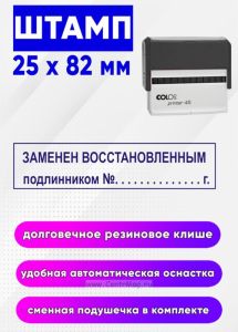 Штамп "Заменен восстановленным подлинником" с указанием порядкового номера восстановления подлинника и даты его восстановления ставят на подлинниках, с которых изготовлены восстановленные подлинники.