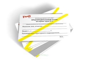 Форма предупредительного талона по охране труда №1 соответствует Приложению А к Положению о порядке применения предупредительных талонов по охране труда в ОАО "РЖД"