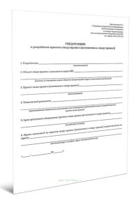 Форма уведомления о разработке проекта свода правил (изменения к своду правил) соответствует Приложению 1 к Постановлению правительства РФ "Об утверждении правил разработки, утверждения, опубликования, изменения и отмены сводов правил" от 1 июля 2016 г. N 624.