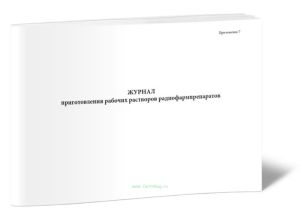 Форма журнала приготовления рабочих растворов радиофармпрепаратов соответствует Приложению 7 к Постановлению Главного государственного санитарного врача РФ СанПиН 2.6.1.2368-08 "Гигиенические требования по обеспечению радиационной безопасности при проведении лучевой терапии с помощью открытых радионуклидных источников" от 16 июня 2008 года.