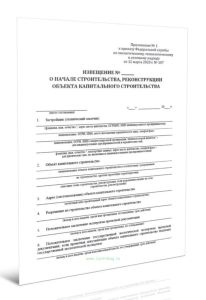 Форма извещения о начале строительства, реконструкции объекта капитального строительства соответствует Приложению 1 к Приказу Ростехнадзора от 12.03.2020 N 107 "Об утверждении форм документов, необходимых для осуществления государственного строительного надзора".