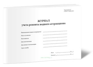 Форма журнала учета ремонта водного аттракциона соответствует приложению Д к ГОСТ Р 52604-2012 Аттракционы водные. Безопасность при эксплуатации. Общие требования